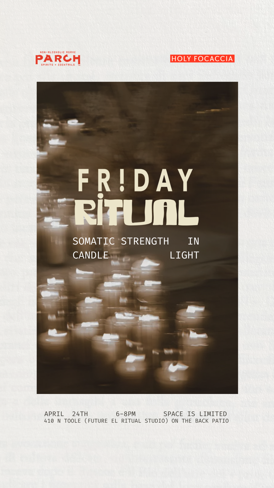 To enjoy a candlelit experience, the strength class guided by Friday Pilates, will run 6:30-7:30pm. Please plan to arrive 15 minutes early to settle in, and linger afterward to enjoy the stars in our private courtyard. Hosted treats from Parch and Holy Focaccia complete the experience.